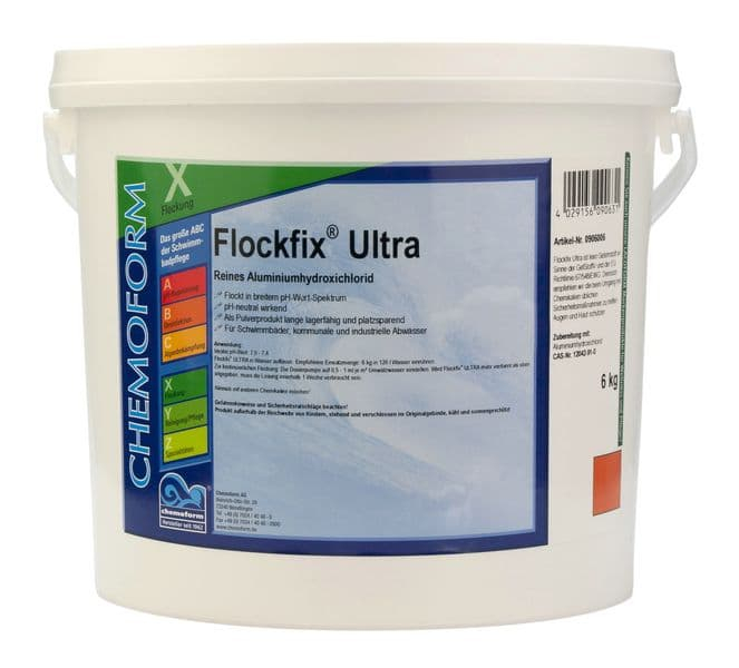 Флокфикс Ультра предназначен для удаления взвешенных частиц, которые сложно очистить в процессе обычной фильтраци. Частицы собираются в крупные хлопья (коагуляты), которые в итоге задерживаются фильтром, либо оседают на дне бассейна. В последствии хлопья удалить водным пылесосом, после чего включить воду бассейна на фильтрацию.